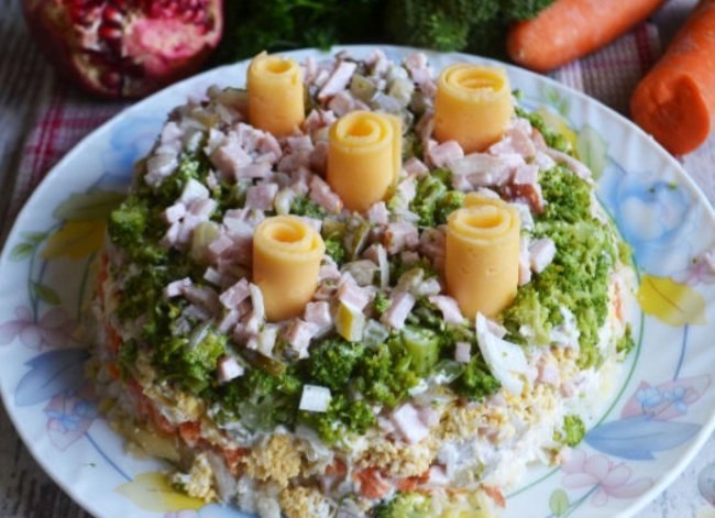 - Повторяем действие — распределяем салатную массу с ветчиной, покрываем брокколи, а сверху последний слой мясного салата.