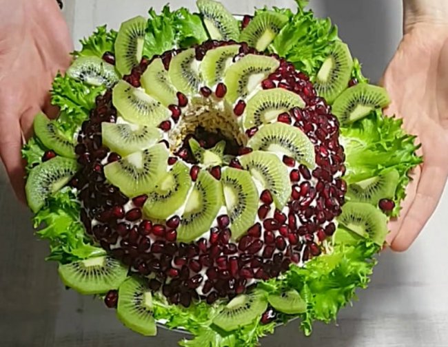Этот салат шикарно смотрится на праздничном столе. Зерна граната и киви идеально сочетаются между собой. Думая, что приготовить новое и интересное, обязательно возьмите на заметку этот рецепт.