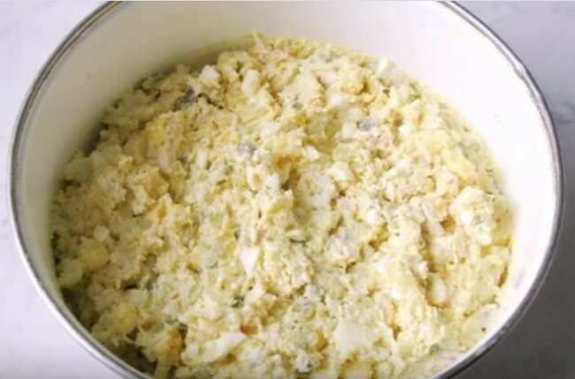- Измельченные продукты соединяем вместе, перчим, солим, заправляем майонезом, перемешиваем.