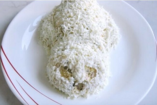 - Руками в перчатках формируем из салатной массы фигуру кролика, посыпаем сырной стружкой и измельченными яичными белками.
