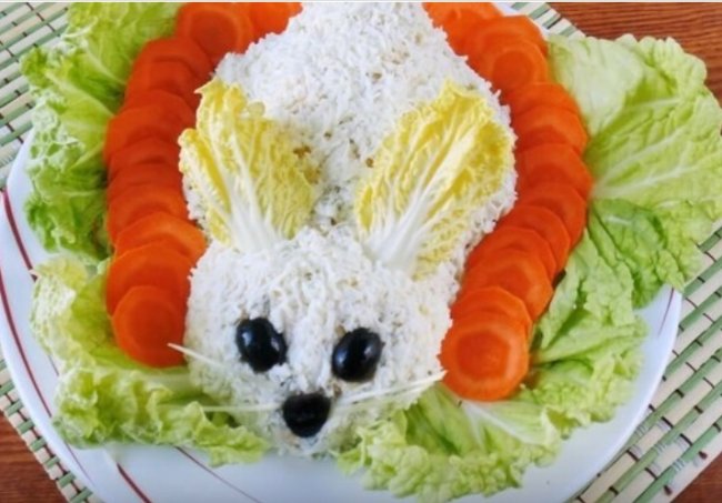 - Кружочками моркови обкладываем кролика, придавая дополнительный декор салату.
