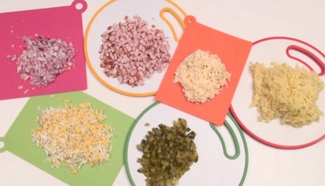 - Так же измельчаем луковицу и огурцы. Сыр превращаем в стружку с помощью терки. Как можно мельче режем мясо.