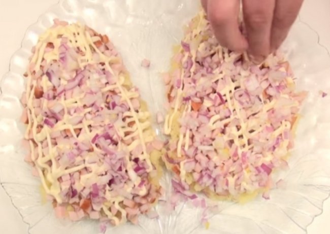 - Далее покрываем измельченными яйцами, пропущенными через терку, и делаем майонезную сеточку.