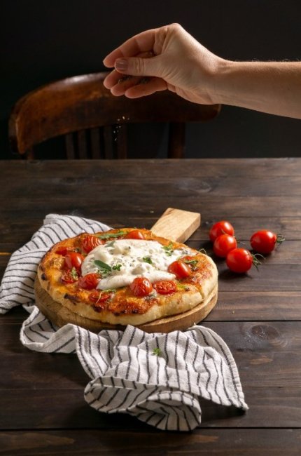 Смешайте ингредиенты, сформируйте основу и выпекайте 10–12 минут при 180°С. Сверху кладите все, что любите: овощи, зелень, сыр, салями и т.п.