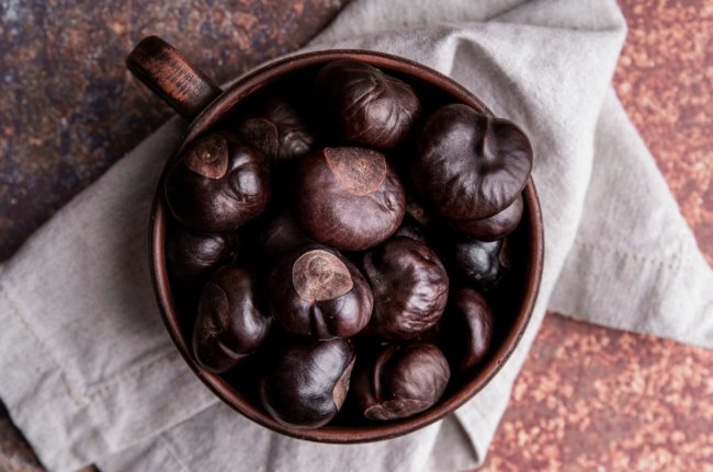 Мякоть готовых каштанов нежная, с легким сладковатым вкусом, напоминающим смесь ореха и батата.