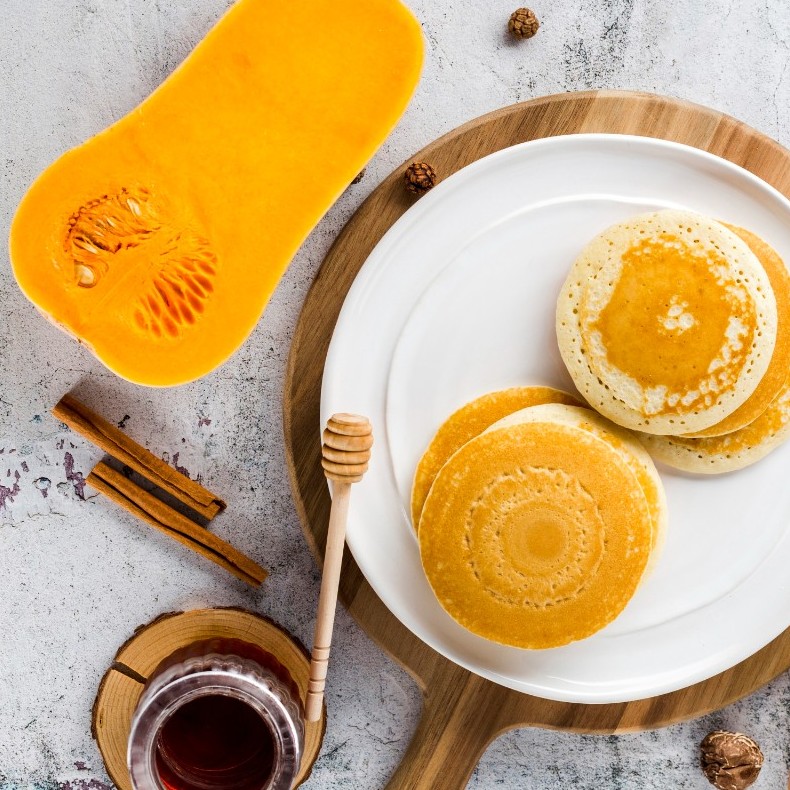 Для завтрака – пышные панкейки с тыквенным пюре. Оно делает тесто влажным, ароматным и придает красивый золотистый оттенок. Подавать лучше с медом или кленовым сиропом, а для красоты можно посыпать сверху семечками тыквы.