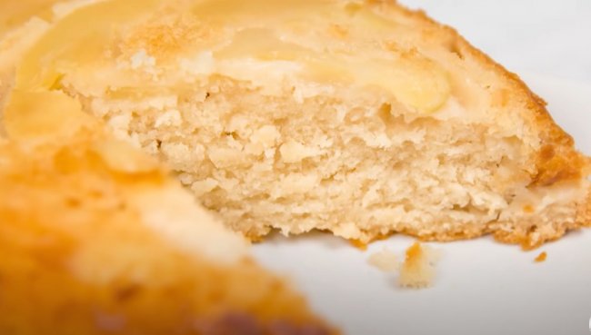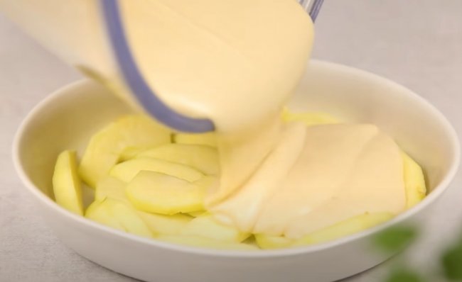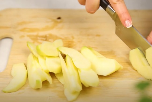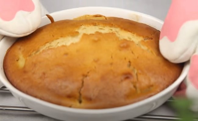 - Очищенное яблоко нарезаем дольками, укладываем в смазанную маслом форму и сверху заливаем тестом. Ставим в духовку на 40 минут (температура 180 °С).