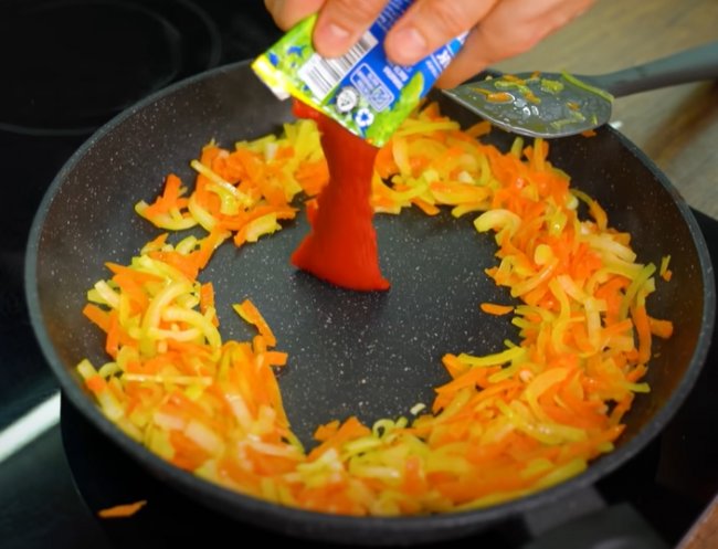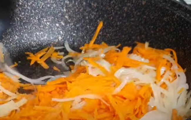 - Сковороду разогреваем, наливаем масло, выкладываем лук с морковью, пассеруем буквально минуту.