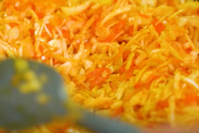 - В сковороду отправляем капусту, перемешиваем и тушим под крышкой от 15 до 30 минут до мягкости. За 5 минут до готовности начинку солим, перчим и кладем лавровый лист.