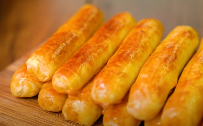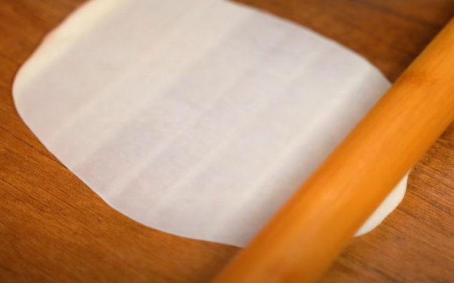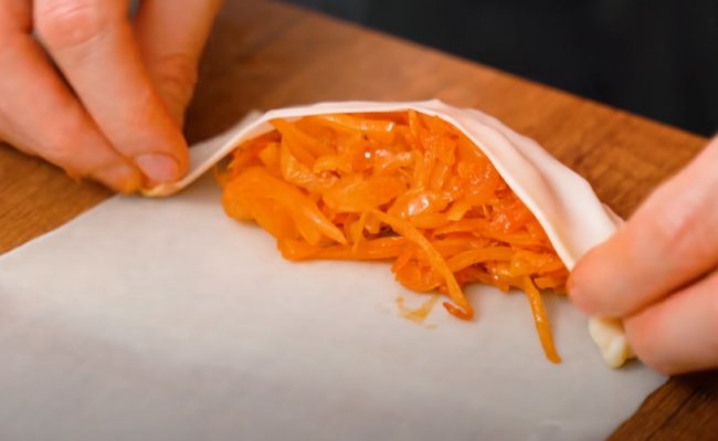 - Каждый кусочек тонко раскатываем, выкладываем начинку, заворачиваем в трубочку, края немного подворачиваем.