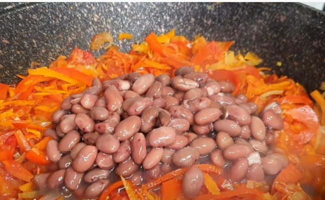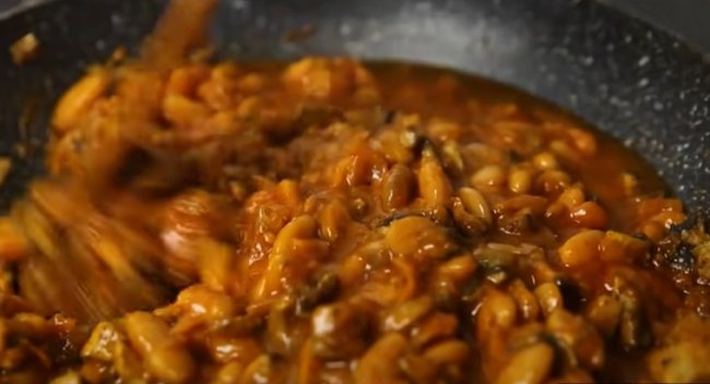- В сковороду выкладываем фасоль в томатном соусе, добавляем острую аджику, перемешиваем и тушим несколько минут.