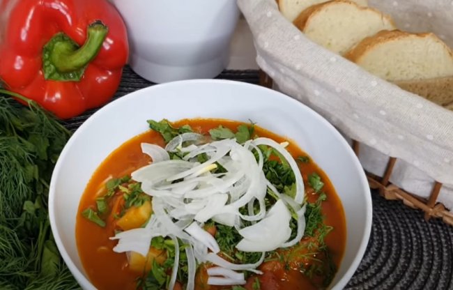 - Полукольцами нарезаем лук и очищенный от семян сладкий перец.