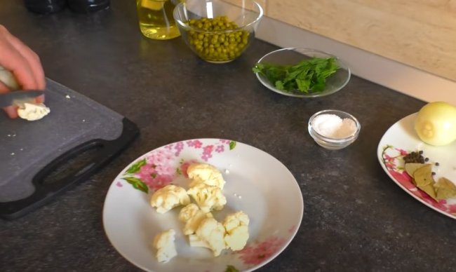 - Разрезаем цветную капусту на соцветия. Если она в замороженном виде, предварительно ошпариваем ее кипятком.