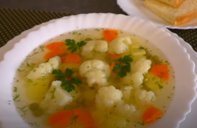 - Цветную капусту разбираем на маленькие соцветия и закладываем в бульон, следом засыпаем мелко покрошенный лук. Вливаем масло и варим 5 минут.