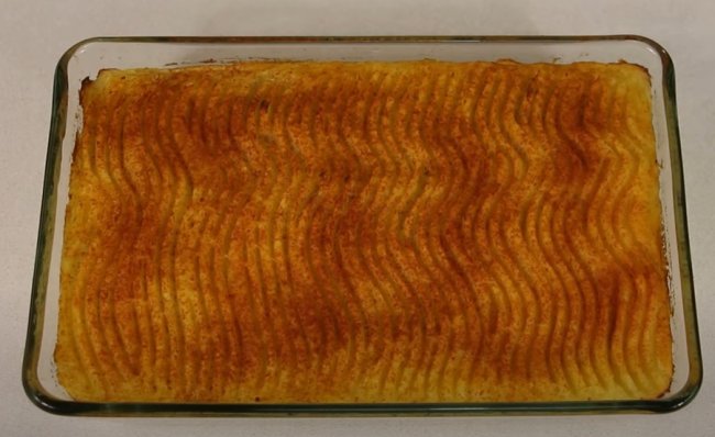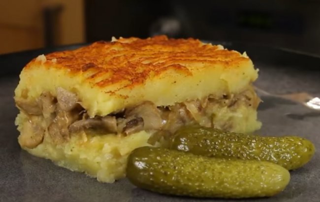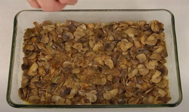 - Теперь слой грибной начинки, которую посыпаем сушеным чесноком и закрываем оставшимся пюре.