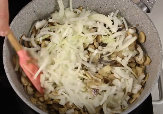 - Затем к грибам вливаем пару ложек масла, засыпаем порезанный кольцами лук и продолжаем жарить до легкой румяности. В конце шампиньоны с луком солим и немного перчим.