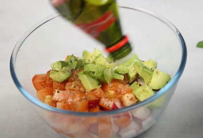 - Авокадо очищаем от кожуры, мякоть режем кубиками.