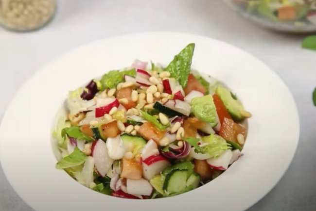 - Отправляем все в салатник вместе с зеленью, поливаем маслом, соком лимона, перемешиваем и по желанию посыпаем грецкими орешками.