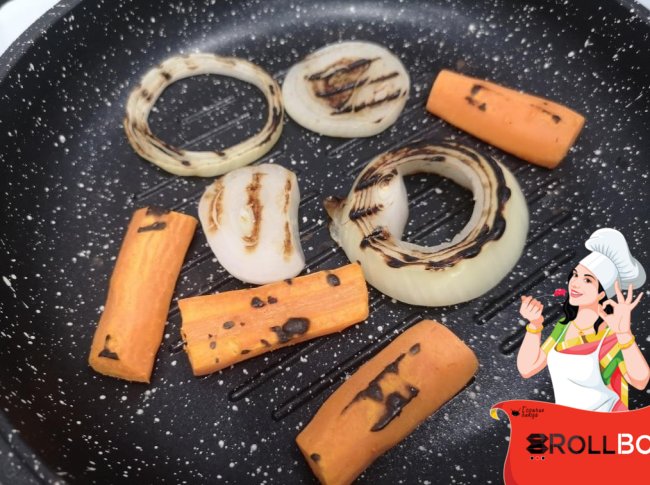 В это же время надо нарезать крупно лук и морковь... и подпечь их на сухой сковороде с двух сторон.