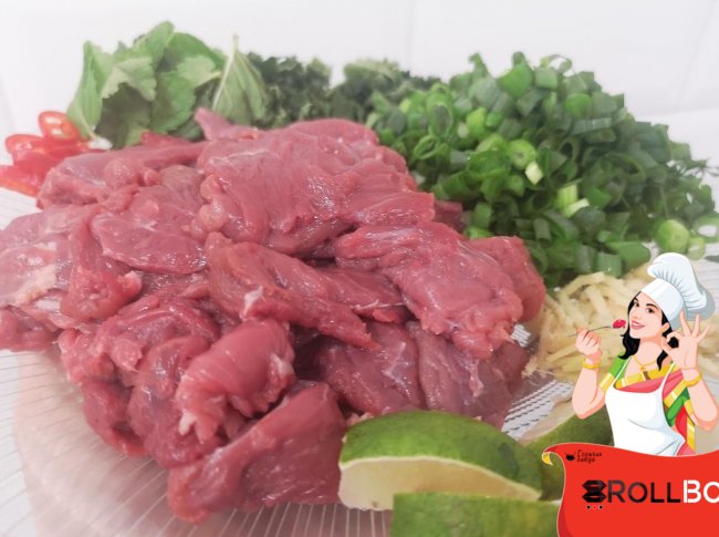 Бульон у нас закипел, теперь кладем в него тонко нарезанную говяжью вырезку на 60 секунд.