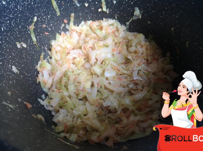 Обжарить на этом масле капусту до слегка карамельного цвета, посолить, перемешать.