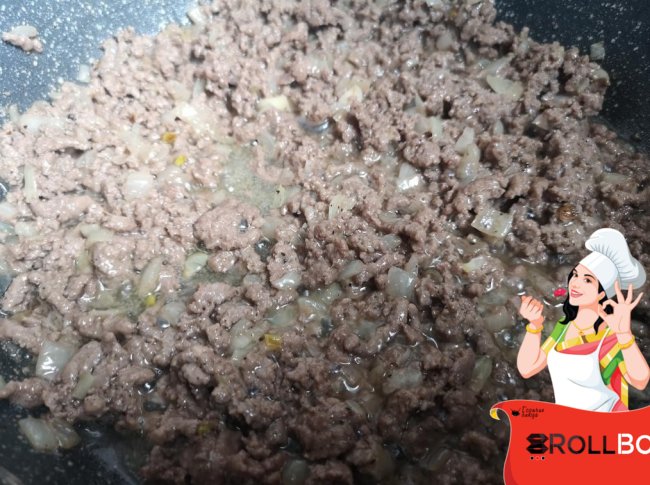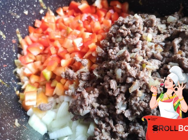 К обжаренному луку добавить фарш. Посолить, поперчить, обжариваем фарш до готовности, и до испарения жидкости.