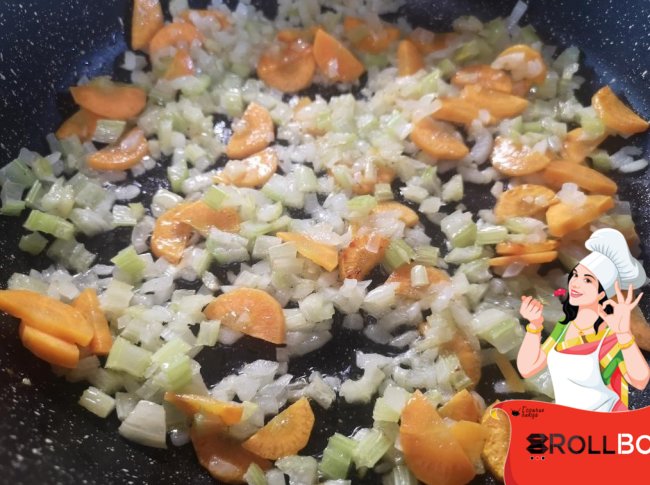 В толстостенной кастрюле разогреть пару ложек оливкового масла. Пассеровать лук, морковь, сельдерей. Кстати, если у вас есть клубень фенхеля, то его тоже можно сюда добавить. Жарить минут 5, до мягкости овощей.