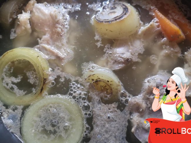 (я делала куриный бульон... сначала я залила суповой набор кипятком... убрала пенку... обуглила морковь и репчатый лук на сухой сковороде, потом вместе с куриным суповым набором и специями потушила в мультиварке часа два... процедила)