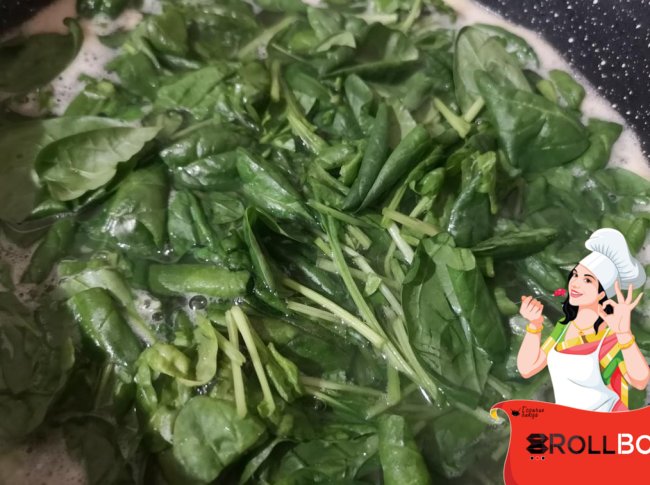 Туда же нашинкованный свежий шпинат... Если он у вас заморожен, советую его обжарить вместе с зажаркой, добавив сливочное масло.