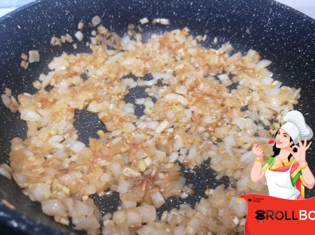 На сковороде на растительном масле обжариваем нарезанный репчатый лук, мелко нарезанный чеснок. Добавляем молотый острый перец (можно заменить на свежий). Подрумянить, помешивая.