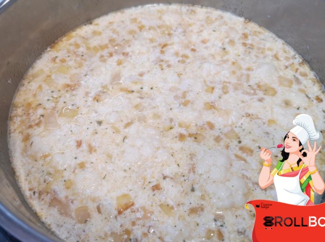 В рыбный бульон вливаем кокосовое молоко и сливки, добавляем плавленый сыр. Доводим до кипения. Кладем цветную капусту (можно заменить на картофель) и обжаренный лук с имбирем. Солим.