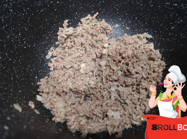 Добавить к луку фарш, обжарить до готовности фарша, в конце посолить, поперчить. (У меня был свино-говяжий фарш, так что жарила минут 20 на среднем огне).