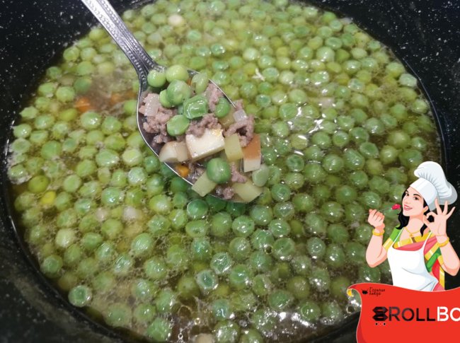 Добавить замороженный горошек (размораживать не нужно!), дать закипеть.