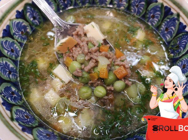 Ингредиенты Фарш говяжий – 250 гр Лук репчатый – 1 шт Морковь – 1 шт Картофель – 1 шт Зеленый горошек замороженный – 400 гр Сыр колбасный копченый – 150 гр Масло сливочное – 1 ст.л. Соль, перец черный молотый – по вкусу Петрушка, укроп (сушеные) -0,5 ч.л. Вода кипяток – 1,5 литра Для подачи –