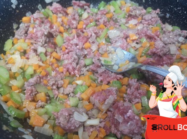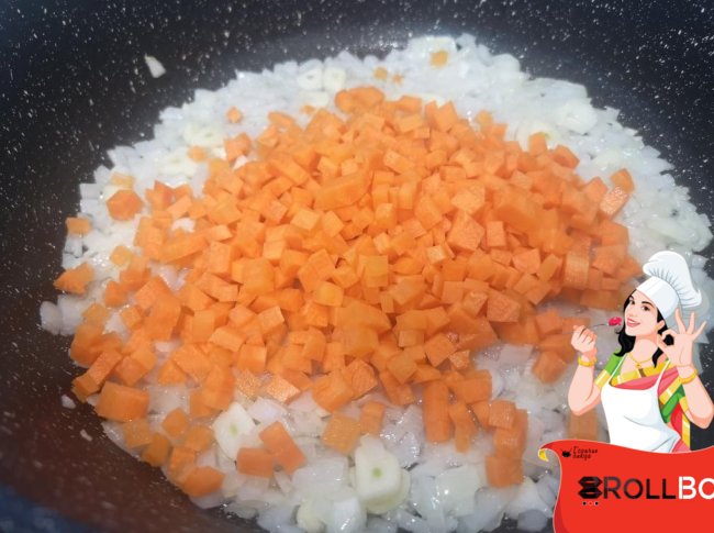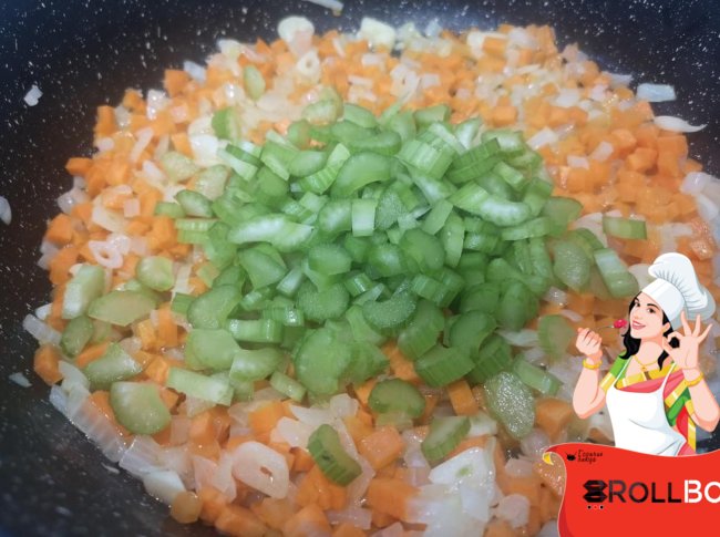 Затем добавила к луку морковь, нарезанную кубиком, и сельдерей, тоже нарезанный помельче. Немного обжарила...