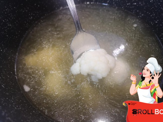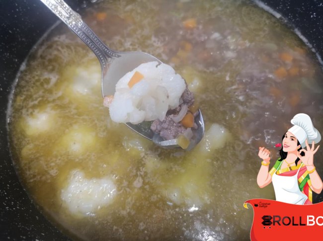 Разогрела бульон (у меня куриный... варила его в ночь с обожженными на сковороде без масла луком и морковью). Посолила немного. Положила в бульон цветную капусту.