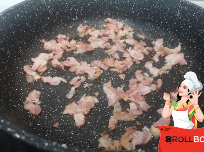 Теперь разогрела сильно сковороду... и обжарила на ней бекон, нарезанный полосками. Жарила без масла... минуты 4.