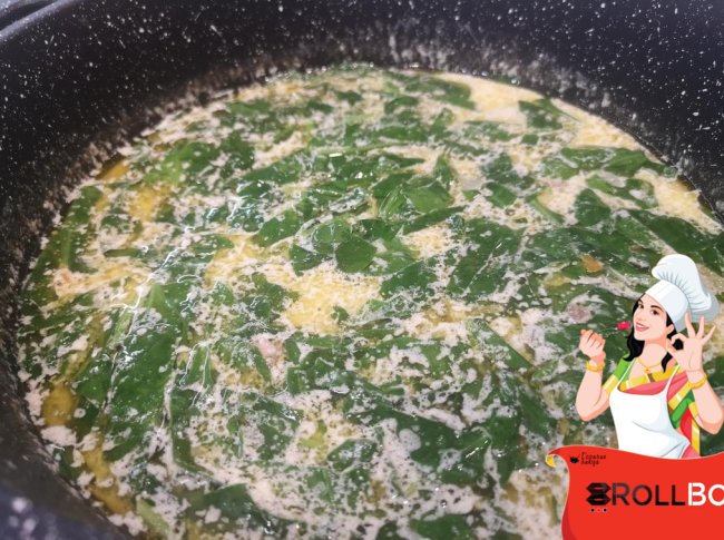 Суп ставим на маленький огонь... Вливаем сливки. Добавляем обжаренный бекон и шпинат.