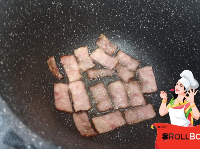 Грудинку нарезала ломтиками и обжарила в кастрюле на небольшом количестве масла до красивого цвета.