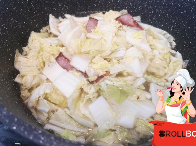 Капусту нарезала крупным кубиком, добавила к грудинке, залила водой и варила минут 20.