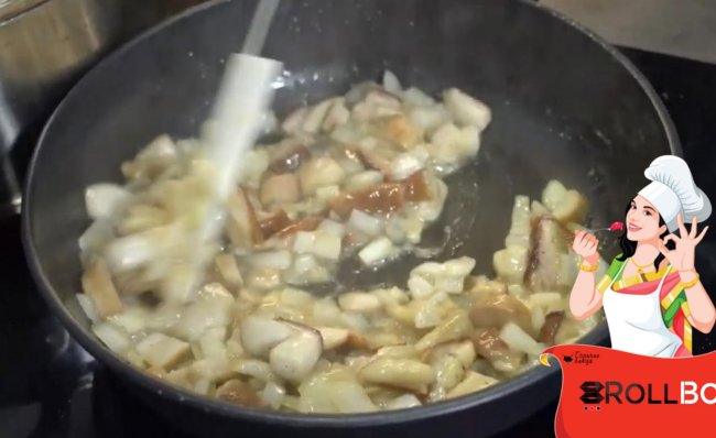 На сковороде обжарить лук, к нему добавить грибы. Сразу посолить-поперчить.