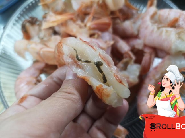 Пока грибы варились, достала из морозилки креветки... я их залила водой, почистила от панциря... разрезала по спинке ножницами и удалила кишку...
