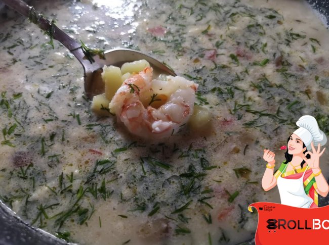 Минуты за три до конца положила очищенные креветки, зелень укропа и чеснок, пропущенный через чеснокодавку.
