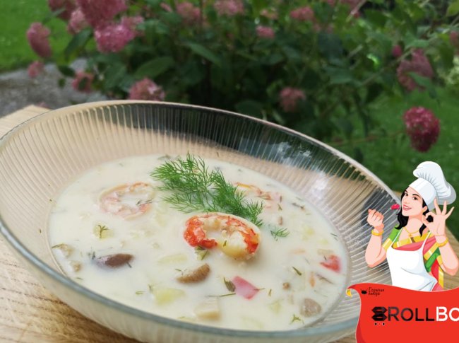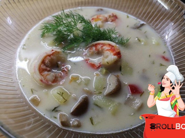Ингредиенты грибы - 300 гр. креветки - 450 гр. (21 шт.) картофель - 5-6 шт. репчатый лук - 1 шт. морковь - 1 шт. помидоры - 1 шт. болгарский перец - полштучки плавленный сыр - 200 гр. соль, молотый черный перец по вкусу вегета по желанию зелень укропа чеснок - 3 зубчика Приготовление Сходила в лес