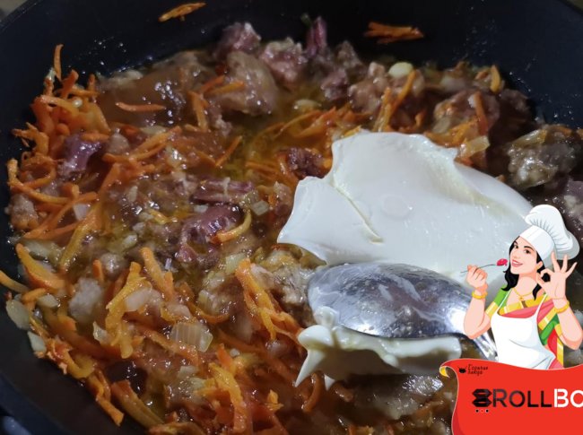 В это время обжаривается лук, нарезанный кубиками и морковь, натертая на крупной терке. Потом к овощам добавляем содержимое банки с тушенкой (у меня говяжья)... все разминаем вилкой... и туда же кладем плавленный сыр. Смотрим, чтобы сыр разошелся.
