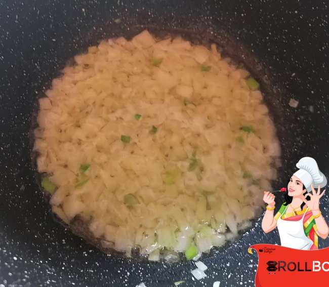 Лук очистите и нарежьте не очень мелко. В кастрюльке разогрейте сливочное масло и обжарьте лук около 2 минут, помешивая.