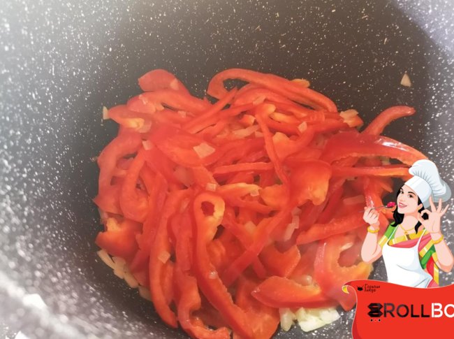 Болгарский перец (цветной) вымойте, очистите и нарежьте полосочками. Добавьте к луку и продолжайте обжаривать все вместе еще минут 7.