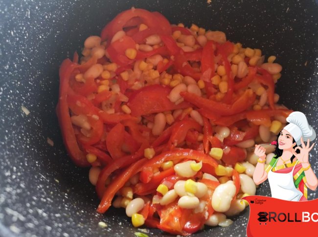 Зубчики чеснока очистите, измельчите и добавьте в кастрюлю к овощам. Перемешайте все и дайте обжариться еще минуту. Затем добавьте в кастрюлю вареную фасоль, промытую консервированную кукурузу.