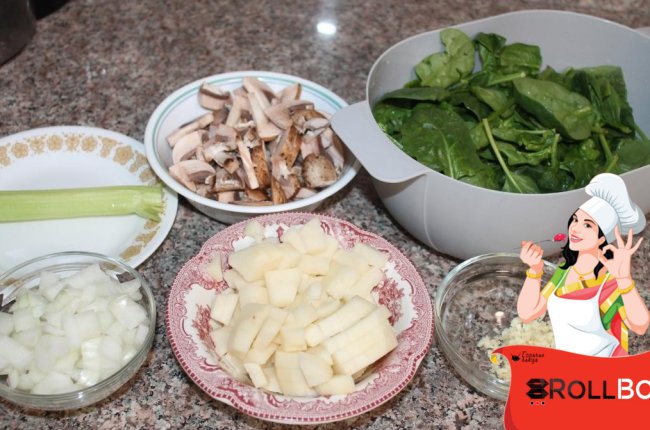 Ингредиенты листья шпината 200 г шампиньоны 100 г чеснок 3 зубчика лук 1 шт. масло гхи 4 ст.л. картофель 2 шт. черешековый сельдерей 1 веточка овощной или мясной бульон 1.5 л соль, перец по вкусу лавровый лист 2 шт Готовим вкусный суп из полезного шпината. Приготовление 1. В кипящий и соленый