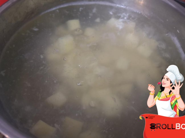 Сначала я поставила вариться нарезанный средними кубиками картофель (2 шт.) в кипящей воде.
